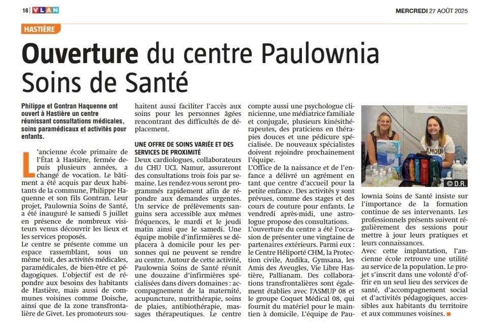 | Hastière : ouverture du centre Paulownia Soins de Santé Philippe et Gontran Haquenne ont ouvert à Hastière un centre réunissant consultations médicales, soins paramédicaux et activités pour enfants. L'ancienne école primaire de l'État à Hastière, fermée depuis plusieurs années, a changé de vocation. Le bâtiment a été acquis par deux habitants de la commune, Philippe Haquenne et son fils Gontran. Leur projet, Paulownia Soins de Santé, a été inauguré le samedi 5 juillet en présence de nombreux visiteurs venus découvrir les lieux et les services proposés. Le centre se présente comme un espace rassemblant, sous un même toit, des activités médicales, paramédicales, de bien-être et pédagogiques. L'objectif est de répondre aux besoins des habitants de Hastière, mais aussi de communes voisines comme Doische, ainsi que de la zone transfrontalière de Givet. Les promoteurs souhaitent aussi faciliter l'accès aux soins pour les personnes âgées rencontrant des difficultés de déplacement. UNE OFFRE DE SOINS VARIÉE ET DES SERVICES DE PROXIMITÉ Deux cardiologues, collaborateurs du CHU UCL. Namur, assureront des consultations trois fois par semaine. Les rendez-vous seront programmés rapidement afin de répondre aux demandes urgentes. Un service de prélèvements sanguins sera accessible aux mêmes fréquences, le mardi et le jeudi matin ainsi que le samedi. Une équipe mobile d'infirmières se déplacera à domicile pour les personnes qui ne peuvent se rendre au centre. Autour de cette activité, Paulownia Soins de Santé réunit une douzaine d'infirmières spécialisées dans divers domaines: accompagnement de la maternité, acupuncture, nutrithérapie, soins de plaies, antibiothérapie, massages thérapeutiques. Le centre compte aussi une psychologue clinicienne, une médiatrice familiale et conjugale, plusieurs kinésithérapeutes, des praticiens en thérapies douces et une pédicure spécialisée. De nouveaux spécialistes doivent rejoindre prochainement l'équipe. L'Office de la naissance et de l'enfance a délivré un agrément en tant que centre d'accueil pour la petite enfance. Des activités y sont prévues, comme des stages et des cours de couture pour enfants. Le vendredi après-midi, une astrologue propose des consultations. L'ouverture du centre été l'occasion de présenter une vingtaine de partenaires extérieurs. Parmi eux : le Centre Héliporté CHM, la Protection civile, Audika, Gymsana, les Amis des Aveugles, Vie Libre Hastière, Pallianam. Des collaborations transfrontalières sont égale ment établies avec l'ASMUP 08 et le groupe Coquet Médical 08, qui fournit du matériel pour le maintien à domicile. L'équipe de Paulownia Soins de Santé insiste sur l'importance de la formation continue de ses intervenants. Les professionnels présents suivent régulièrement des sessions pour mettre à jour leurs pratiques et leurs connaissances. Avec cette implantation, l'ancienne école retrouve une utilité au service de la population. Le projet s'inscrit dans une volonté d'offrir en un seul lieu des services de santé, d'accompagnement social et d'activités pédagogiques, accessibles aux habitants du territoire et aux communes voisines. Source : Vlan 27 août 2025 |